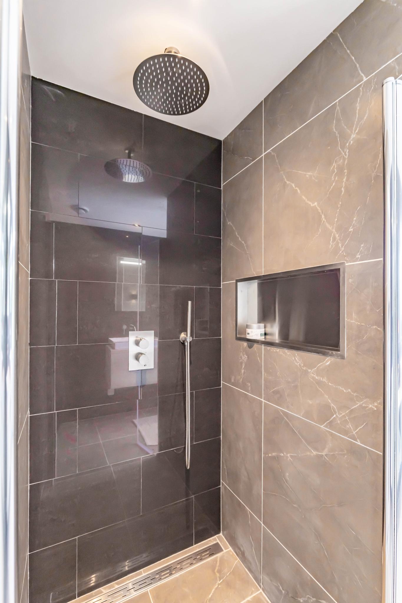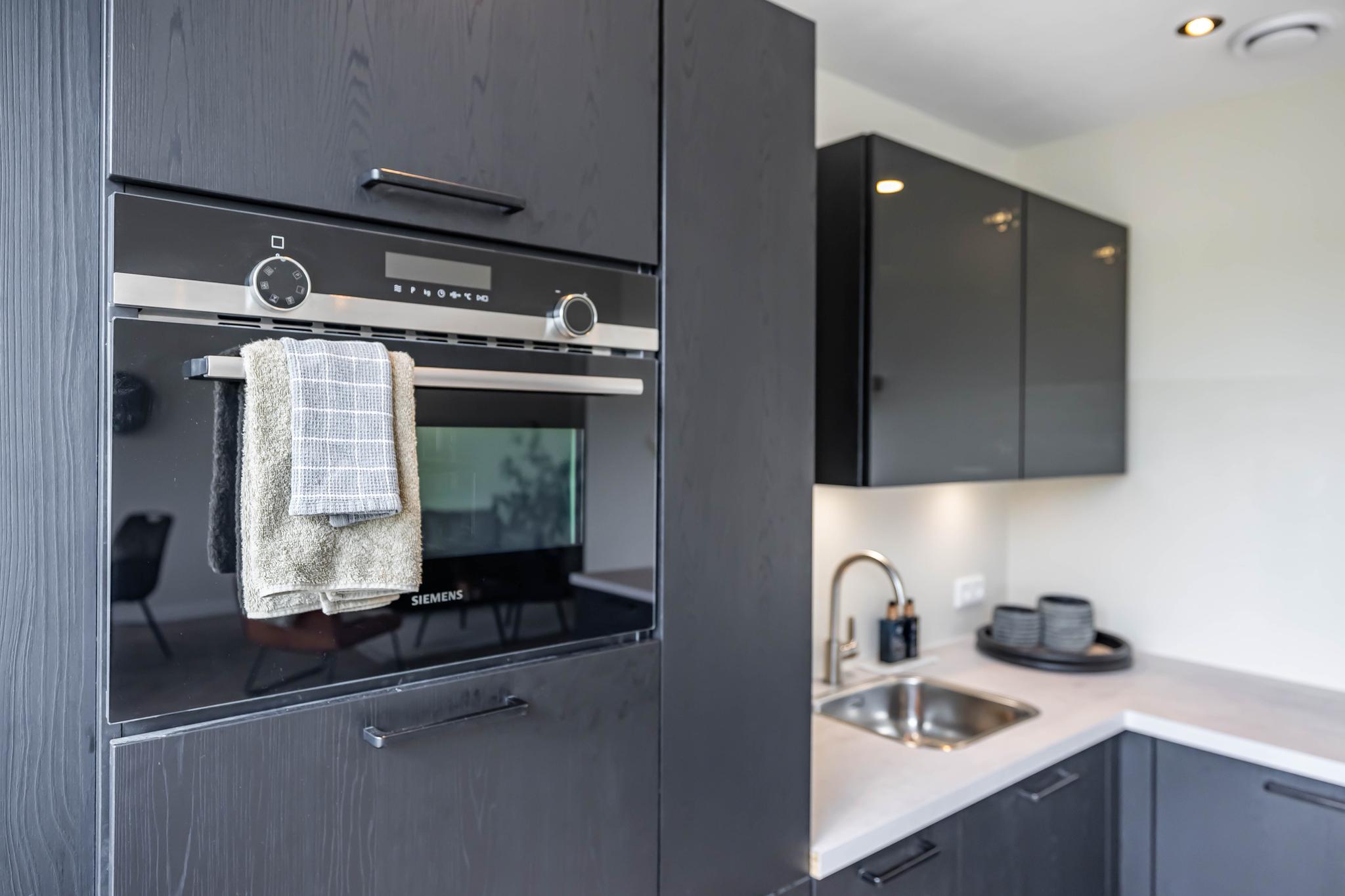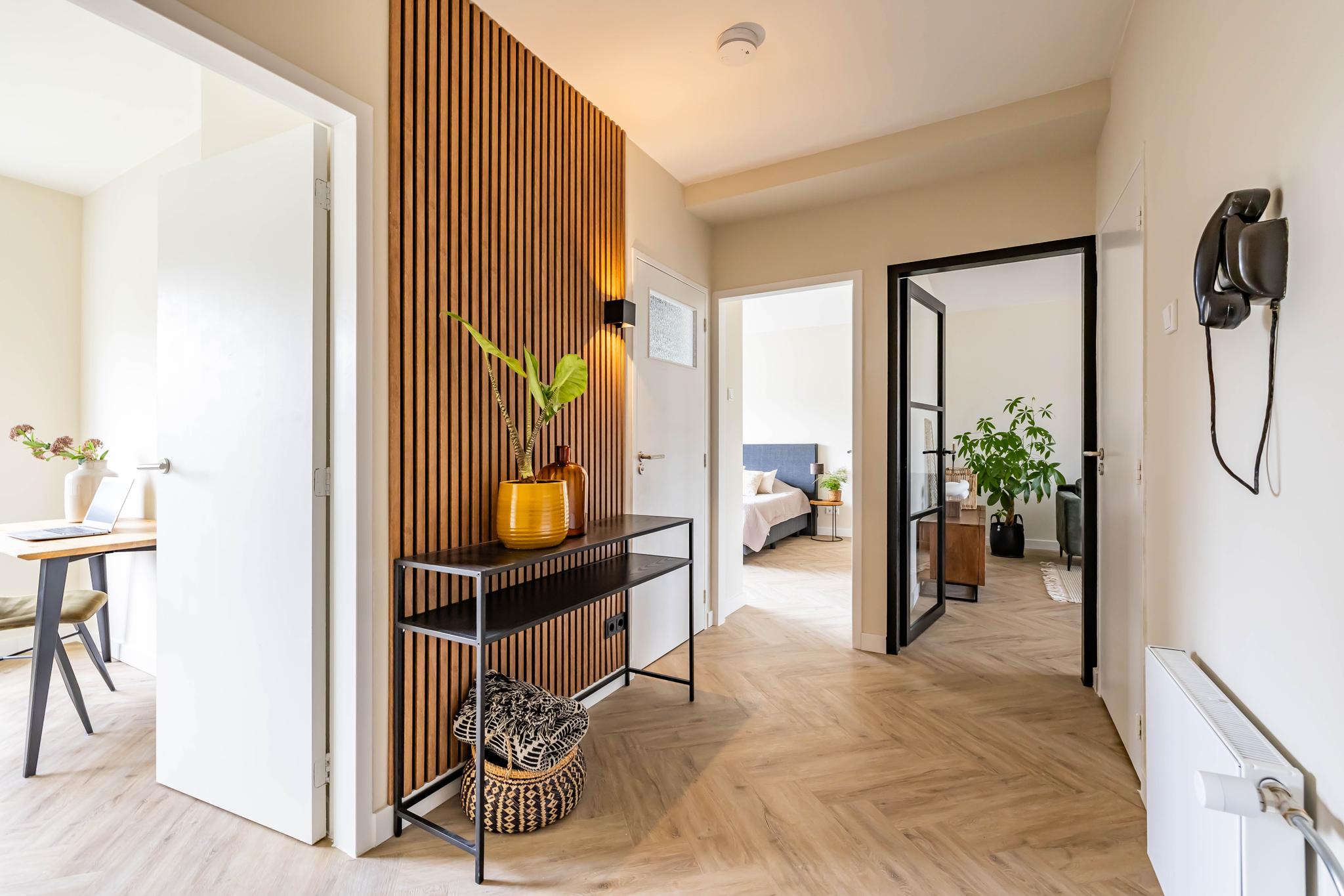 De indeling van het appartement is op gave manier gewijzigd, waardoor er een lichte en ruime open keuken is ontstaan. Met Siemens inbouwapparatuur, mat zwarte keukenkastjes en genoeg ruimte voor de eettafel, is de perfecte plek om te koken en fijn te dineren, om vervolgens op het balkon nog de zonsondergang te zien. De grote ramen zorgen voor veel licht, waardoor de woonkamer uitnodigend en warm aanvoelt. En natuurlijk dragen de gestucte muren en visgraad PVC-vloer hier ook aan bij. Ook is de badkamer verplaatst (waar voorheen de keuken gevestigd zat), waardoor deze nu veel ruimer is geworden. Het moderne ligbad trekt de aandacht, samen met de marmeren tegels, raampartijen en toegang tot het tweede balkon, waan je je in luxe!
