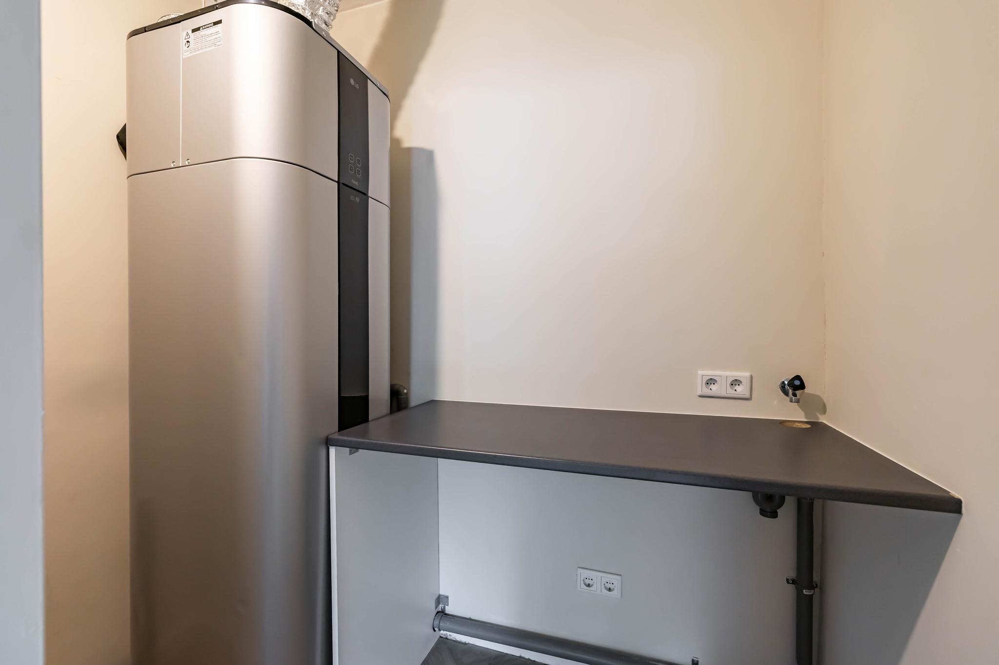 De nieuwe warmtepomp-boiler (2024) met ventilatie-systeem draagt niet alleen bij aan het wooncomfort, maar ook aan een lagere energierekening. En er is in de bijkeuken nog voldoende ruimte voor een wasmachine en droger.